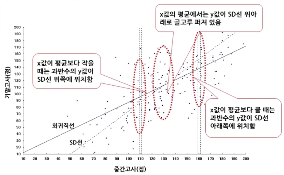 - 반면 중간고사에서 평균보다 낮은 110점 받은 학생들의 기말고사 평균 점수는 96.1점으로 표준단위로 볼 때 상승했음