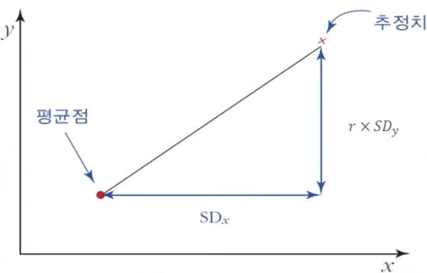 - x 값이 x 평균값에서 $1SD_x$증가할 때 y값은 y평균값에서 $r x \times SD_y$